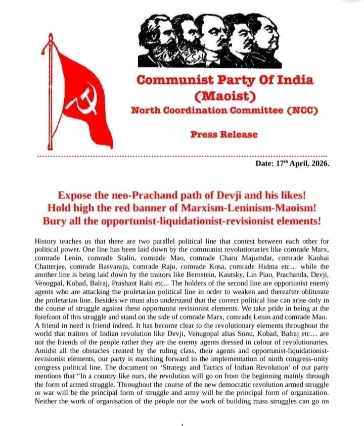 जगदलपुर,30 अप्रैल 2026:नक्सल मोर्चे से एक ऐसी खबर सामने आई है, जिसने माओवादी संगठन के भीतर चल रही खामोश लड़ाई को अचानक बेनकाब कर दिया है। आत्मसमर्पण कर चुके शीर्ष माओवादी नेता वेणुगोपाल देवजी को लेकर अब संगठन के अंदर खुला टकराव शुरू हो गया है। नॉर्थ कोऑर्डिनेशन कमेटी (NCC) द्वारा जारी एक प्रेस नोट ने पूरे घटनाक्रम को और ज्यादा सनसनीखेज बना दिया है।