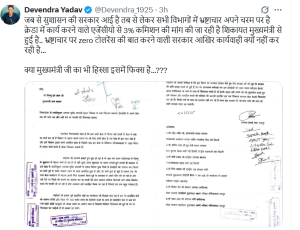 उन्होंने सोशल मीडिया प्लेटफार्म X पर लिखा कि भ्रष्टाचार पर जीरो टोलरेंस की बात करने वाली सरकार आखिर कार्रवाई क्यों नहीं कर रही है। क्या मुख्यमंत्री जी का भी हिस्सा इसमें फिक्स है? साथ ही कांग्रेस ने कहा कि चंदा दो धंधा लो भाजपा की नीति है।