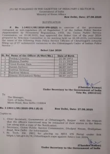 रायपुर 27 अगस्त 2025: छत्तीसगढ़ पुलिस सेवा के 7 अधिकारियों को भारतीय पुलिस सेवा (आईपीएस) में पदोन्नति मिली है। गृह मंत्रालय, भारत सरकार ने 27 अगस्त 2025 को अधिसूचना जारी कर दी।