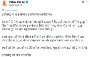 मुख्यमंत्री साय ने कहा कि हम सभी के लिए यह अत्यंत गर्व और खुशी का क्षण है कि छत्तीसगढ़ के अनिमेष कुजूर ने ग्रीस में आयोजित ड्रोमिया इंटरनेशनल स्प्रिंट मीट में 100 मीटर दौड़ को मात्र 10.18 सेकेंड में पूरा कर नया राष्ट्रीय रिकॉर्ड कायम किया है। इससे पहले अनिमेष ने दक्षिण कोरिया में हुए एशियन एथलेटिक्स चैंपियनशिप में 200 मीटर दौड़ को 20.32 सेकेंड में पूरा कर एक और राष्ट्रीय रिकॉर्ड अपने नाम किया था। उन्होंने युवा खिलाड़ी अनिमेष को बधाई देते हुए कहा कि आपकी यह ऐतिहासिक उपलब्धि हर युवा को आगे बढ़ने की प्रेरणा देगी। छत्तीसगढ़ को आप पर गर्व है।
