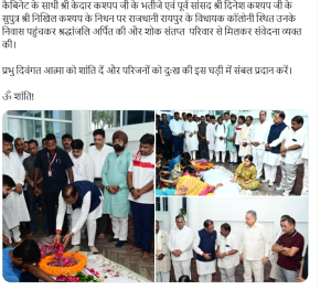 रायपुर 23 जुलाई 2025: मुख्यमंत्री विष्णु देव साय ने आज राजधानी रायपुर स्थित विधायक कॉलोनी में आयोजित शोक सभा में शामिल होकर वन मंत्री केदार कश्यप के भतीजे एवं बस्तर के पूर्व सांसद श्री दिनेश कश्यप के सुपुत्र स्वर्गीय श्री निखिल कश्यप को श्रद्धांजलि अर्पित की। मुख्यमंत्री ने स्व. निखिल कश्यप की पार्थिव देह पर पुष्पांजलि अर्पित कर उन्हें अंतिम विदाई दी तथा शोकाकुल परिजनों से भेंट कर गहरी संवेदना प्रकट की।