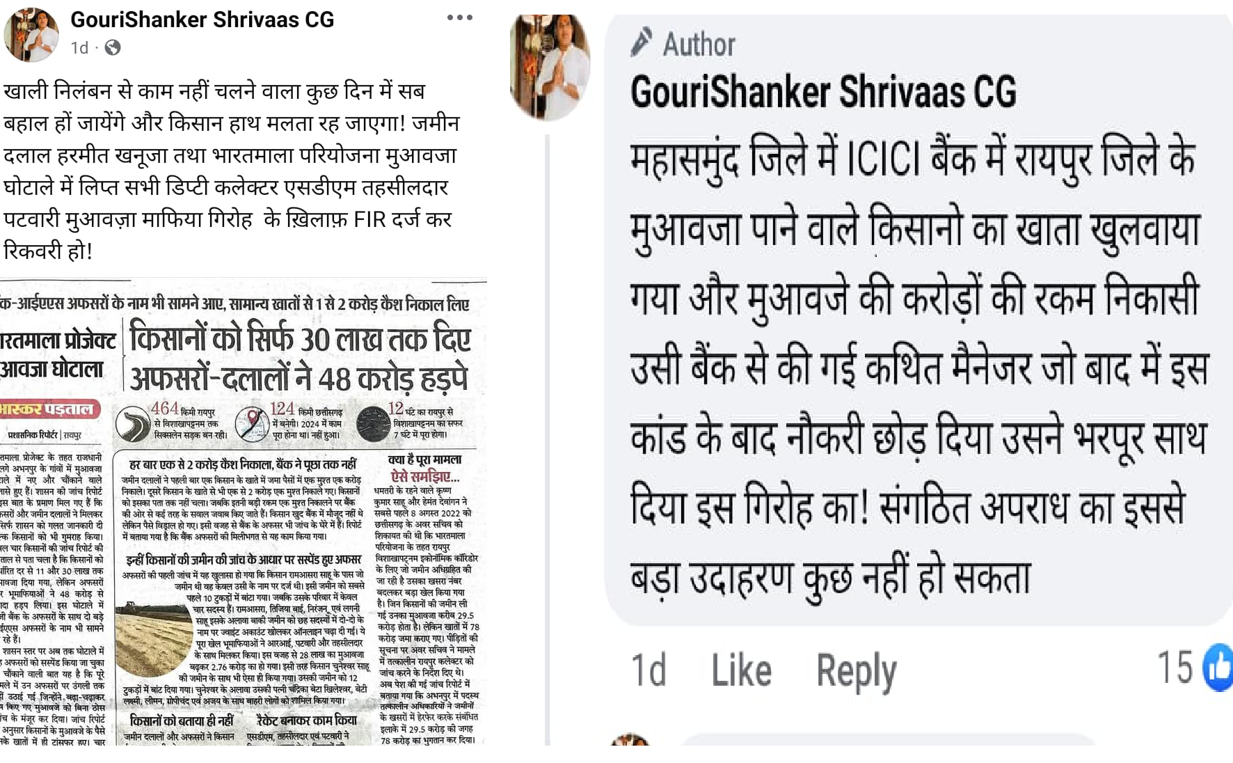 श्रीवास ने सोशल मीडिया में लिखा कि रायपुर जिले के किसानो का बैंक खाता महसमुँद जिले के आईसीआईसीआई बैंक में खोला गया और उसी बैंक से करोडो की रकम निकाली गई। बैंक मैनेजर ने बाद में नौकरी छोड़ दिया और गिरोह का भरपूर साथ दिया है। बताते है कि घोटाले में शामिल जमीन दलाल मूलतः महासमुंद निवासी है, और उसी ने आईसीआईसीआई बैंक में किसानो का खाता खोलवाया था।