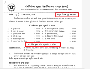 रविशंकर शुक्ल विश्वविद्यालय में शैलेंद्र कुमार पटेल मूलपद उपकुलसचिव है। 25 मई 2022 को तत्कालीन कुलसचिव गिरीशकांत पांडेय को हटाने के बाद व्यवस्था बनाने तत्कालीन कुलपति डॉ केसरीलाल वर्मा ने पटेल को कुलसचिव का प्रभार दिया था,,ताकि कार्यालयीन व्यवस्था बनी रहे। उसके बाद से अब तक उच्च शिक्षा विभाग ने विश्वविद्यालय में स्थाई/रेगुलर कुलसचिव की नियुक्ति नहीं की है। उसके बाद भी शैलेंद्र कुमार पटेल ने प्रभारी कुलसचिव की जगह स्वयं को कुलसचिव बताया जा रहा है। सरकारी दस्तावेजों,नोटशीट और नेमप्लेट में भी स्वयं को कुलसचिव दिखाया जा रहा है, जो नियमतः गलत है। दरअसल साल 2023 तक के कार्यपरिषद की बैठकों में शैलेन्द्र पटेल को प्रभारी कुलसचिव बताया जाता था, फिर अचानक पटेल ने स्वयं से कुलसचिव बताना शुरू कर दिया। इसी बात को लेकर कार्यपरिषद की बैठक में सदस्य ने आपत्ती की, ऐसे में कुलपति डॉ सचिदानंद शुक्ला को बतौर अध्यक्ष वस्तु स्थिति स्पष्ट करना था, पर कुलपति ने ऐसा नहीं किया।